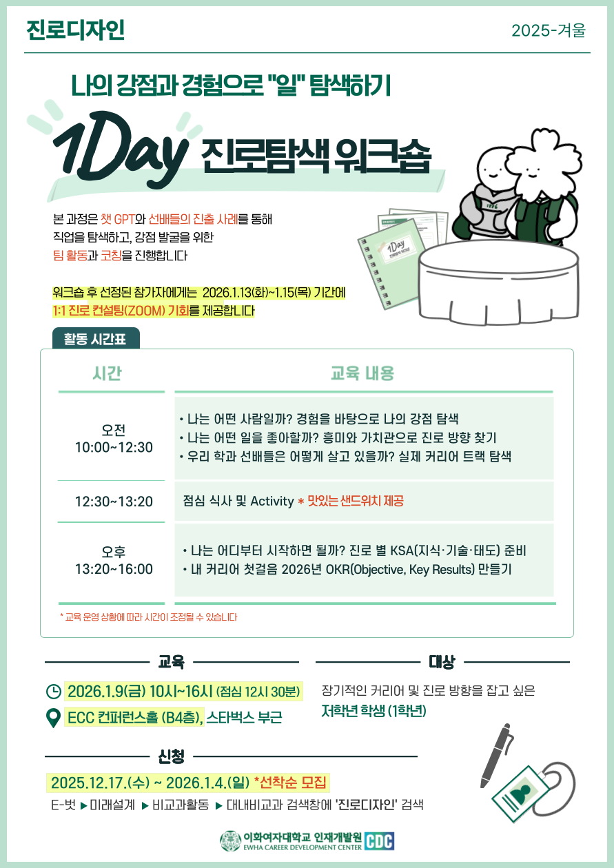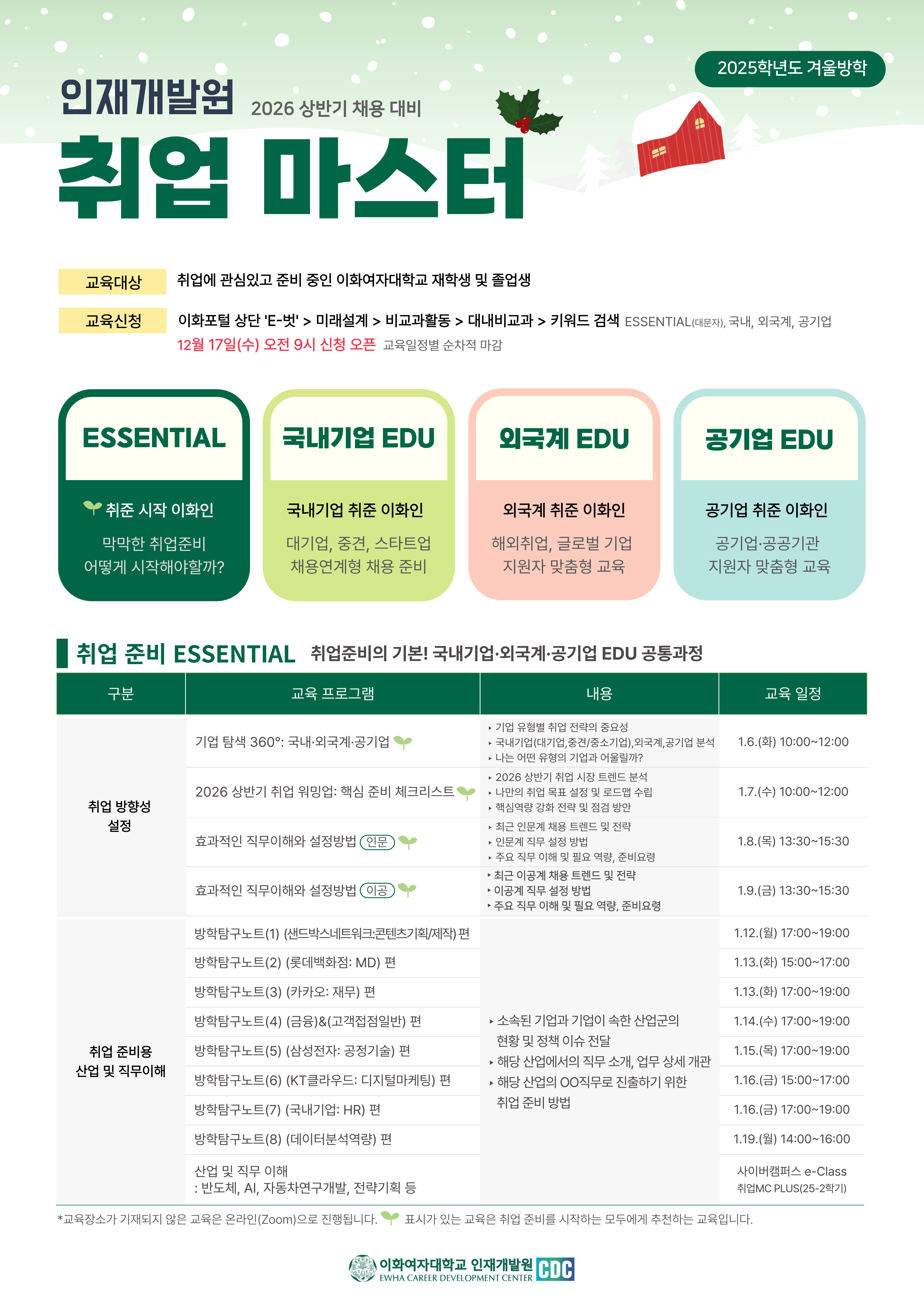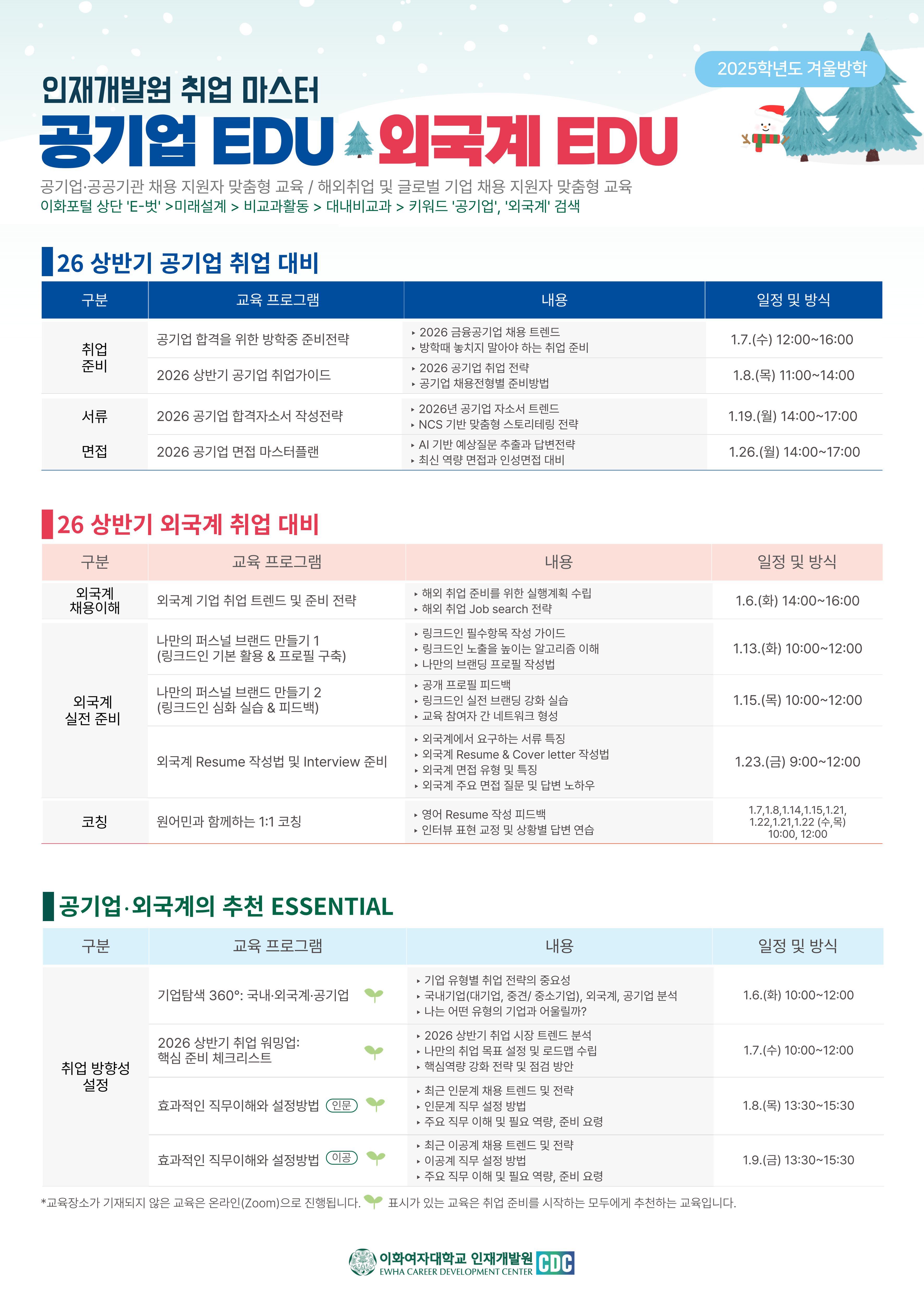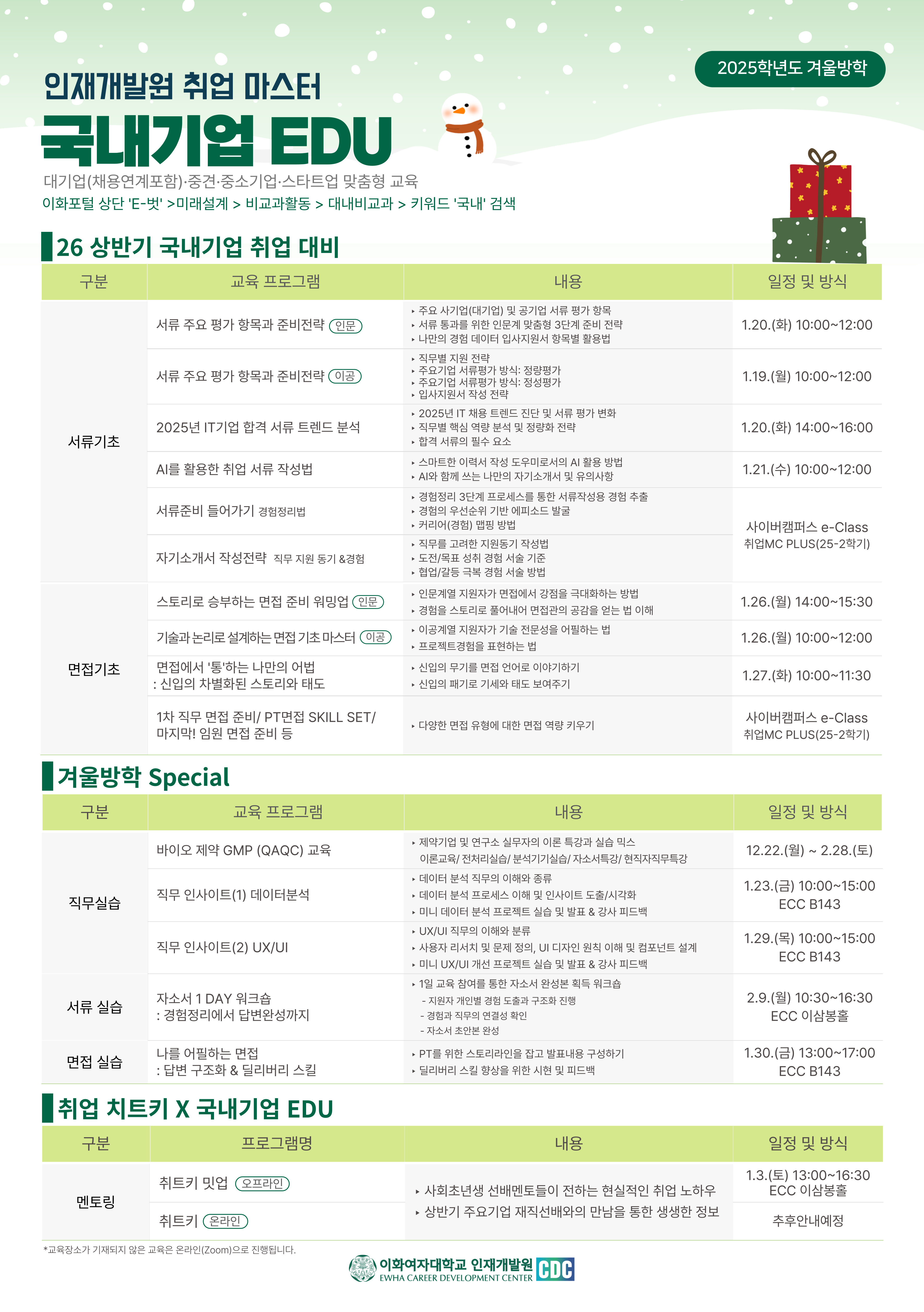 fnctId=bbs,fnctNo=260 글번호 33031 작성일 2025.12.22 수정일 2025.12.22 작성자 emusic 조회수 33 [기타] 2025학년도 겨울방학 진로·취업 교육프로그램 안내 인재개발원에서 개설하는 2025학년도 겨울방학 진로·취업 교육프로그램을 다음과 같이 안내드립니다. 많은 참여 바랍니다. 첨부파일 첨부파일이(가) 없습니다.